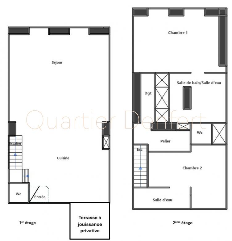 Le 1er niveau s’ouvre sur une entrée, donnant accès à une cuisine ouverte, aménagée et neuve, prolongée par une pièce de vie conviviale. L’ensemble, d’une surface de 50 m², offre de beaux volumes et une circulation fluide. Ce niveau bénéficie également d’un accès direct à une terrasse de 5 m², végétalisée, aménagée avec soin (plantes, arbustes) et à jouissance exclusive, offrant un agréable prolongement extérieur. Un WC invités complète cet étage.